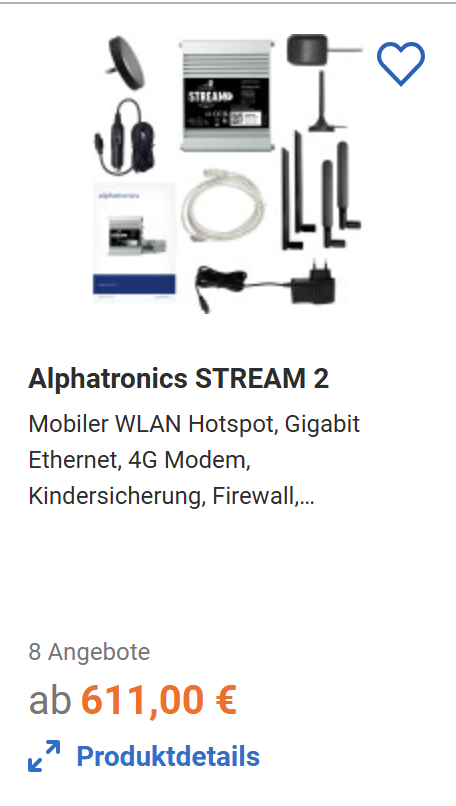 oder Kombisysteme, die neben Mobilfunk auch ein eventuell vorhandenes WLAN verstärken und über einen Router an die Endgeräte bringen. Hier sei als Beispiel das Stream 2 von Alphatronics genannt, das über 2 slots für SIM-Karten sowie mehrere LTE- und WiFi-Antennen verfügt. Mit dem Router sind Geschwindigkeiten bis zu 300 Mbit/sek möglich. Der Preis liegt aktuell bei 619€.