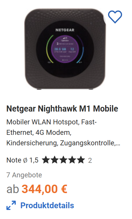 Daneben werden auch batterie- bzw. akkubetriebene Router ohne Außenantenne angeboten, z.B. der Netgear Nighthawk M1, der den Zugriff mehrerer Geräte auf das Internet über das 4G-/LTE-Netz zulässt. Der aktuelle Preis (im November 2025) für den M1 beträgt 344€.