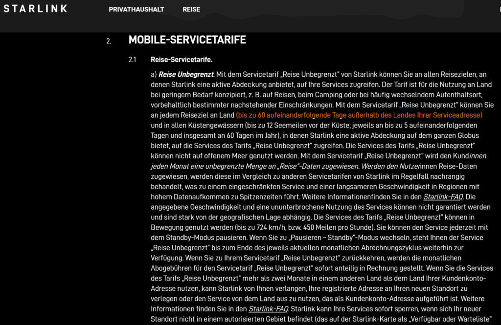 Möchte man über Starlink ins Internet, dann benötigt man die mobile Starlink-Antenne (249€) und den zugehörigen Tarif für den Empfang auf Reisen. Aktuell (November 2025) kosten 50GB 40€ pro Monat und unbegrenztes Volumen gibt es für 89€ pro Monat. Die Antenne ermöglicht Downloadgeschwindigkeiten bis zu 100 Mbit/sek und setzt freie Sicht auf den Satelliten voraus, funktioniert also nicht gut in bewaldeten Gegenden. Zu beachten sind die Starlink Servicetarif-Beschreibungen, wonach man Starlink nur 60 Tage am Stück außerhalb seines Heimatlandes (“Serviceadresse”) nutzen darf, was für Digital Nomads wie auch Überwinterer nicht ausreicht. Keine Ahnung, was sich Starlink dabei gedacht hat. Starlink-Nutzer, die über vier Monate in Spanien standen, sagten mir, dass diese Regel praktisch nicht störe, da man seine “Serviceadresse” beliebig bei Starlink wechseln kann. OK, aber warum dann diese 60-Tage-Regelung?