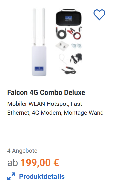 Dort wo WLAN oder Mobilfunk schwach sind kann man Lösungen einsetzen, die die Signale verstärken, indem Außenantennen mit einem Router kombiniert werden. Hier gibt es Systeme, die nur das Mobilfunksignal verstärken, z.B. die Falcon 4G Combo mit LTE-Außenantenne, Router und Zubehör, die bis zu 150 Mbit/sek bietet und aktuell bei 199€ liegt